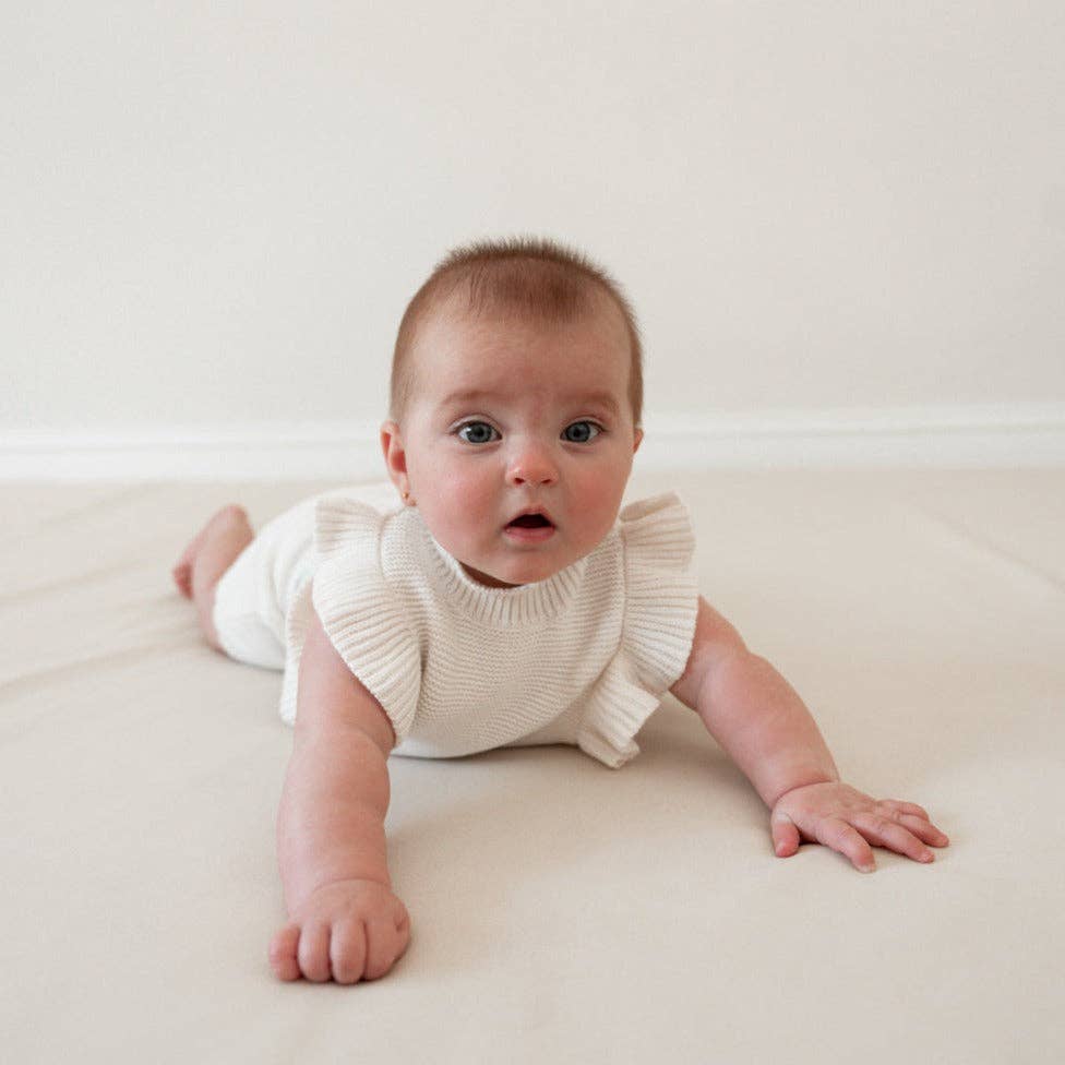 Introducing our charming knit ruffle set for your little girl! Made from 100% cotton, this outfit set is both soft and comfortable, ensuring your baby stays cozy during warm weather. The vanilla color of this set makes it perfect for any occasion, while the adorable ruffle detailing on the top and shorts adds a touch of fun and femininity to the design. The knit fabric provides warmth on cooler days yet remains breathable for hotter temperatures. To make dressing your baby girl easy and fuss-free, we've added wood buttons to the bloomers, allowing you to easily change your little one. The shorts also have an elastic waistband, making them both comfortable and secure.
